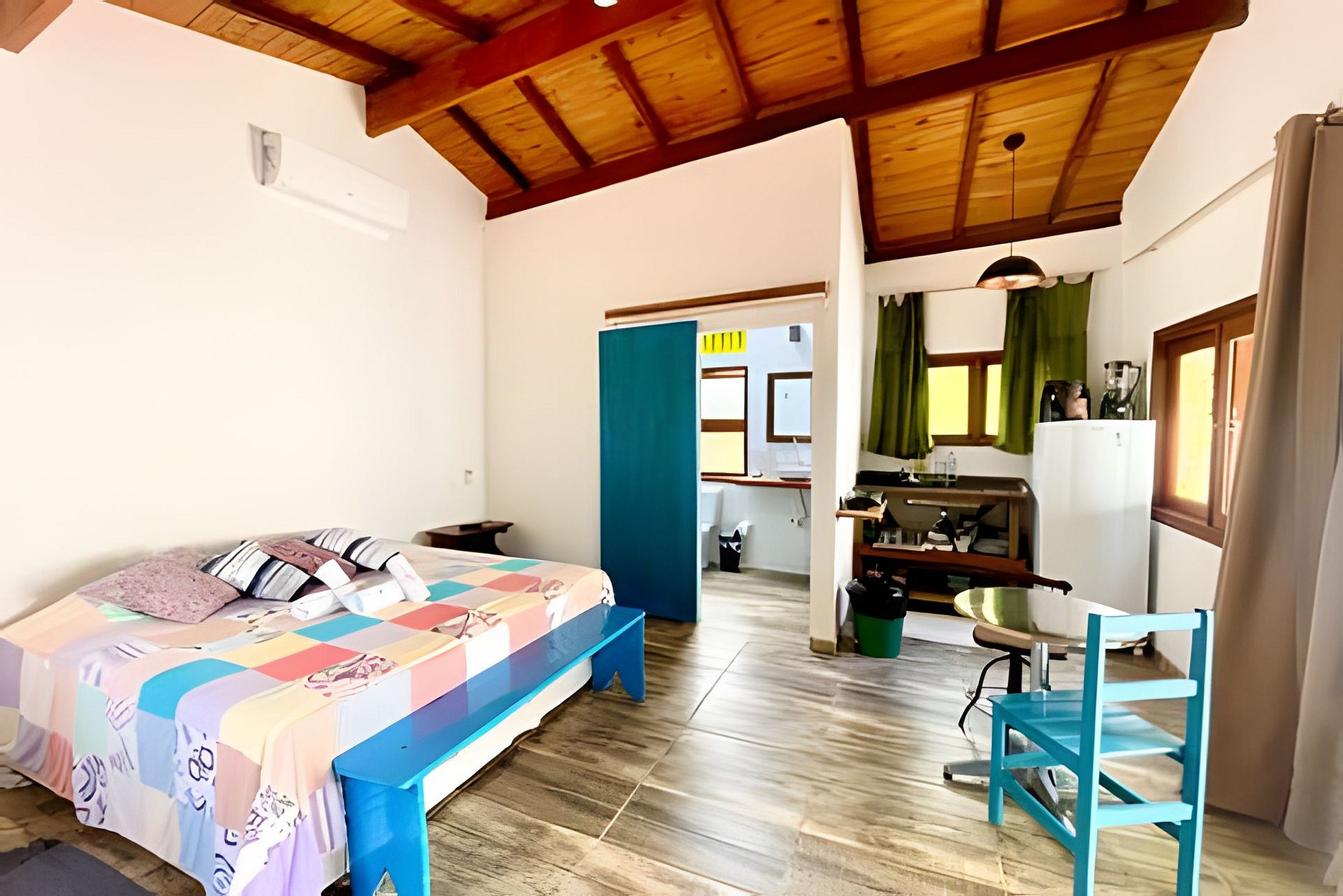 Loft aconchegante para duas pessoas, com cama queen extremamente confortável, cozinha compacta e banheiro com teto de vidro para apreciar a natureza. Ambiente climatizado, TV, airfryer e utensílios completos. Localizado em condomínio tranquilo na Praia da Santa Tereza, a poucos minutos da Vila e de toda a vida cultural e gastronômica do Centro Histórico.